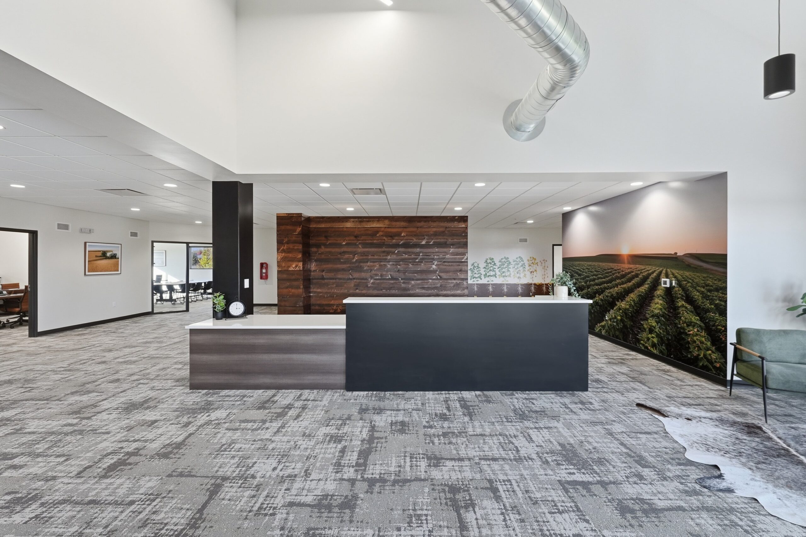 The Nebraska Soybean Board’s new office is a warm, welcoming space that reflects the spirit of agriculture through its earthy color palette and thoughtful details. Shades of green and brown throughout the space echo the fields and soil of Nebraska, while playful touches like turf accents and a photo wall featuring natural textures connect directly to the land. Subtle nods to farming, like the windmill-inspired ceiling fan and organic patterns, bring the story of agriculture indoors, creating an environment that feels both grounded and forward-thinking.